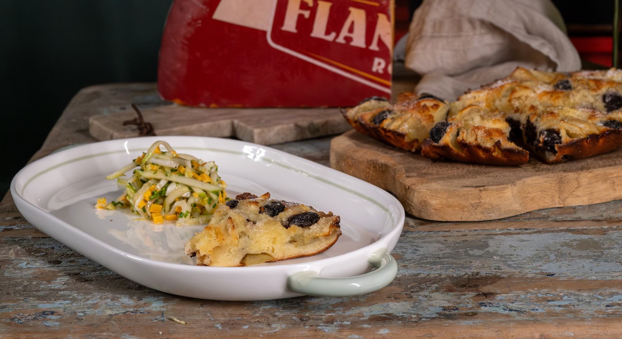Haal de taart uit de oven en draai om. Besprenkel met wat Calvados en bestrooi met fijne suiker. Snijd de appeltaart in stukken en schik op borden. Serveer met het witloofslaatje.