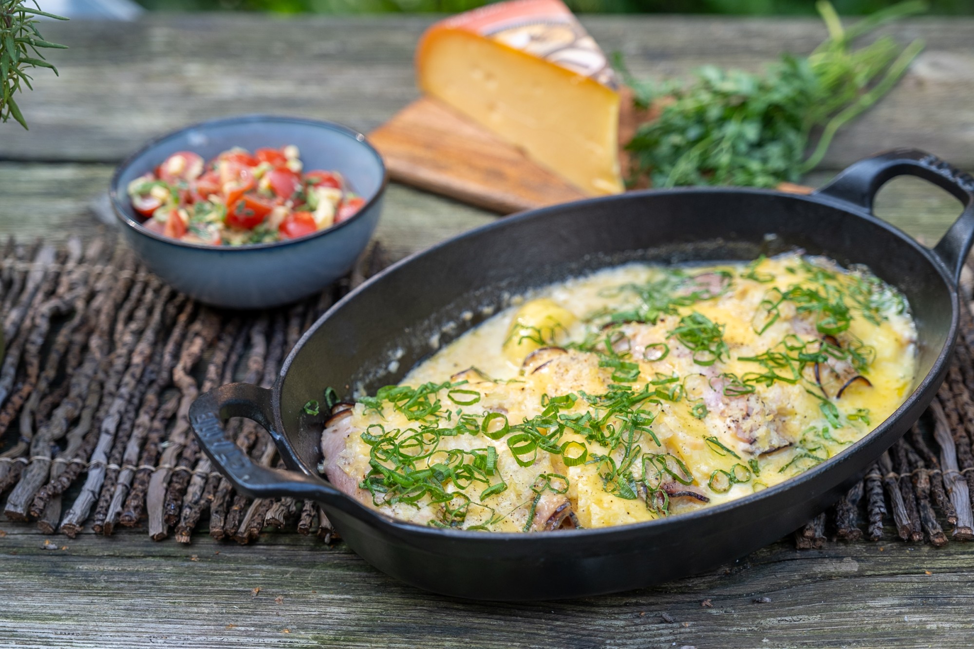 Vet een ovenschaal in met een beetje boter. Schik de hamrolletjes en plakjes aardappel mooi in de schaal, afwisselend of in lagen. Snijd de Flandrien Gerijpt in dunne plakjes en verdeel deze over de hamrolletjes en aardappelen. Kruid af met peper. Schenk de roomsaus gelijkmatig over de schotel, zodat alles goed bedekt is.